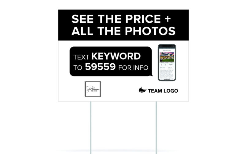 Capture prospective buyers’ phone numbers and provide them with a virtual open house link to view the property and other listings nearby with KWKLY signs. These 24×18″ double-sided yard signs are completely customizable and in full-color on 4mm Coroplast with H-stakes. Order one for every listing and keep a few spare signs in your trunk.